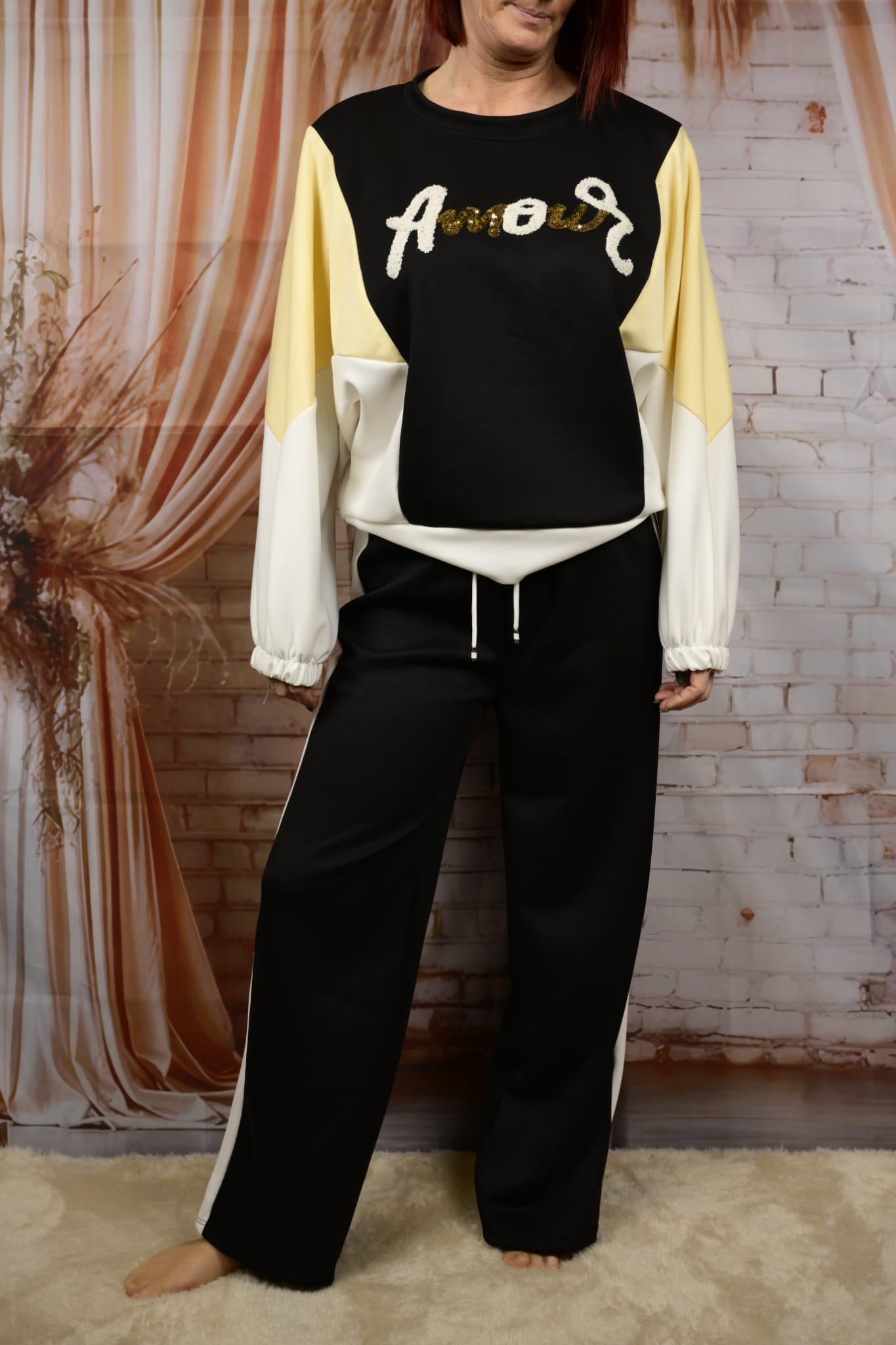 Dit stijlvolle huispak combineert ultiem draagcomfort met een trendy look. De opvallende "Amor" tekst met gouden details en de kleurrijke mouwen maken dit huispak alles behalve saai. Perfect voor luie zondagen, Netflix-marathons of gewoon om je goed te voelen thuis!