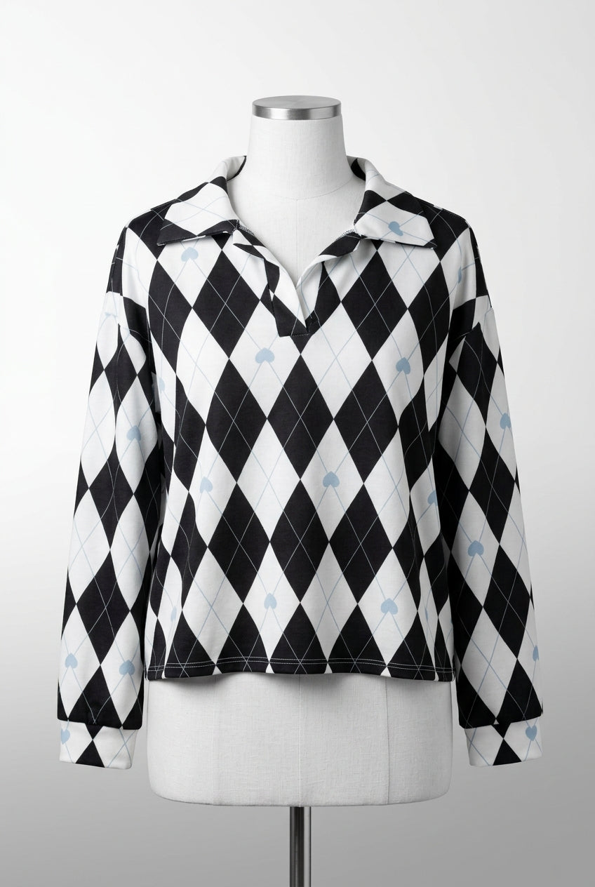 Het argyle patroon is een tijdloze klassieker die nooit uit de mode raakt. Deze blouse geeft een moderne twist aan het traditionele design door de zachte pastelkleuren en relaxed pasvorm. Perfect voor wie houdt van een speelse, preppy stijl met een vleugje nostalgie.
