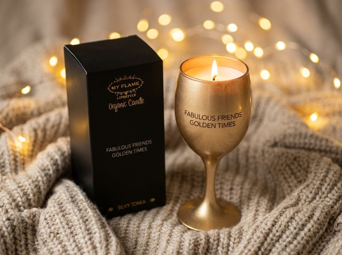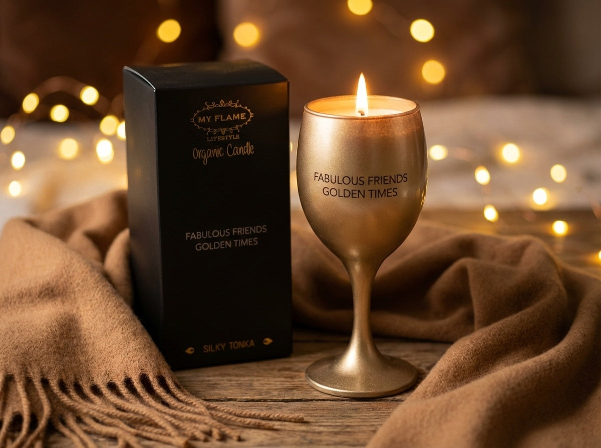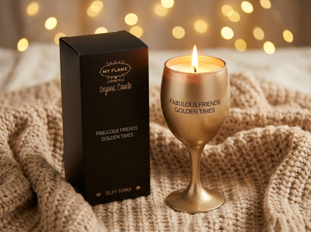 Te leuke geurkaars in een gouden wijnglas. De kaars is gemaakt van biologische sojawas en heeft de geur Silky Tonka. De kaars brandt ca. 30 uur.